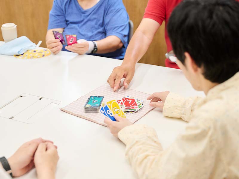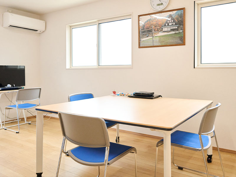 当事業所では、ご利用者さまお一人おひとりの状態や状況に合わせて、簡単な作業活動や運動を行っていただいています。また、ゆっくりと休むことができるように「居心地のいい居場所作り」や仲間との「つながり・支えあいのある空間」の提供を目指しております。